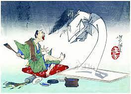 森で様々なお化けが出てくるが「古い、古い」と動じない飛脚にぴちぴちの鯛に化け土産にしようとする飛脚に「これでも古いか!」