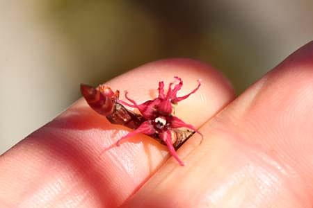 マルバノキの花はほかの落葉花木とは違い、落葉し始めた頃、葉の付根に暗紅色の花を2個背中合わせにしてつけます。それに花がイソギンチャクのように見えますよね。