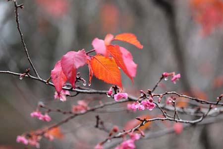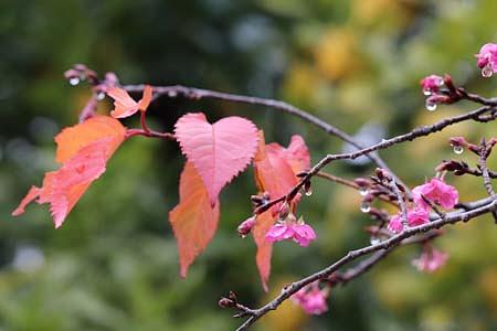 紅葉と桜の花が1本の木で同時に見られるのは不思議な感じがしました。