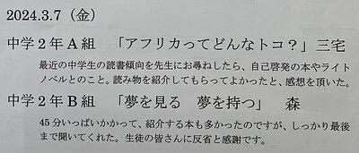 2024年06月09日 光泉中学BT☆2,3年生 草津おはなし研究会 • 草津市 詳細 中学校・高校(おはなし・BT等) ブックトーク 中学生 2年 3年 南草津 お気に入りに追加 6月3日(月)光泉中学BT報告3年A組、B組2年A組、B組 この記事を報告する 不適切な内容や規約違反を発見した場合はご報告ください