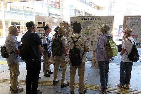 本日の予定を説明板を使って、東見附から西見附まで枚方宿を歩くと確認されました。