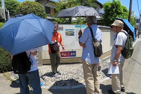 日差しが強くなる中、東見附まで歩き、天野川の架け橋等の説明を受けました。