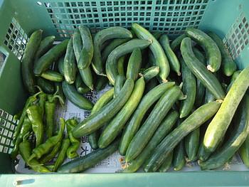 収穫したキュウリと甘トウガラシ。この収穫カゴ2杯になりました。