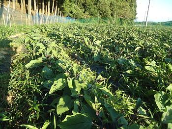 楽農舎のキュウリ畑です。えっ!キュウリがぶら下がっていないって?楽農舎では土の渇きを抑えるためと使い切りのキュウリネットを使わないために、このように栽培しています。