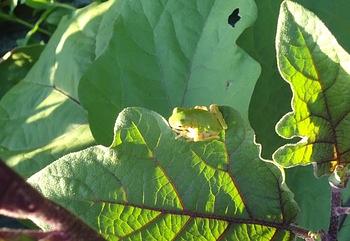小さなアマガエルがナスの葉の上で夕日を浴びていますね。