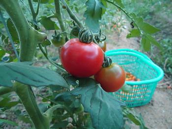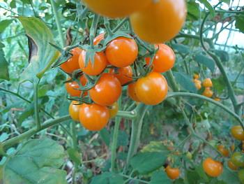 このトマトはオレンジチャームです。甘くて、収穫しながらつい口にも・・・。暑いので水分たっぷりで甘いトマトがうれしいです。