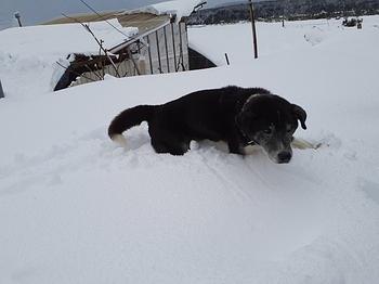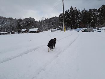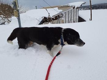アッサムを連れて農園へ。雪の中で歩きにくそうですね。
