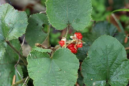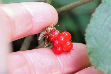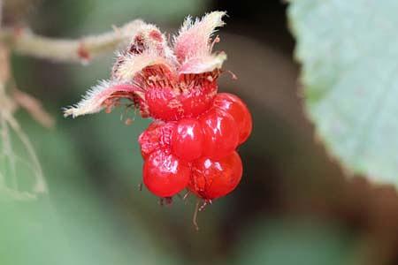 花期は9月から10月で、葉腋から花茎を出し、穂状に花弁が5枚の白い花を数個つけます。晩秋から一ヵ月かけて赤い果実がなり、11月から1月のころに熟します。いわゆる木苺の形で、食用となり、木苺としては旨い方と言われています。多くの木苺類は夏に熟しますが、フユイチゴは冬に熟することが和名の由来です。
