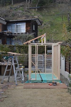 屋根の骨組みまで出来ました。雨が降るのでここまで。