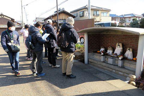 旧東海道を京に向かい、街道沿いに後ろ向きに建てられている子守地蔵の説明を受けました。 大名行列の前に飛び出した子供と母親が無礼打ちされ、母子を悼んで建てられたとか。