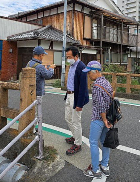 この後、旧中山道を北上、歌川広重が守山宿を描いたとする土橋をシッカリ見ているお二人と、カメラに遊ばれている一人。 今では数mしかありませんが、当時は30~40mの川幅だったとのことです。