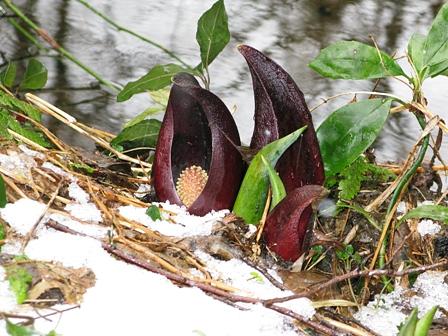 例年ならば、ザゼンソウは、そろそろ見頃を迎える時季だが、ザゼンソウは雪に埋もれ、顔を出している姿は、ほんの僅かしか見られなかった。