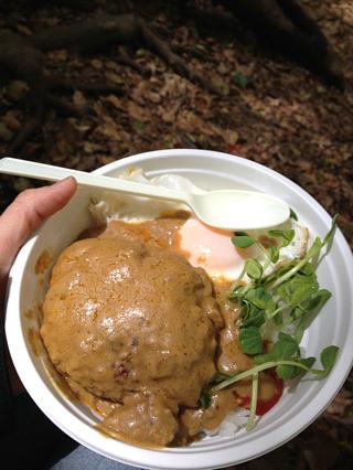 飲食もいろいろあって~私は豆乳カレーソースロコモコを木の根っこに座って、ライブを遠目に眺めがら食べて