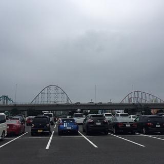 こんなお天気でも、すっごい人やけどわかります?高速の出口がすでに行列。13,000台停められるらしいんだけど、いっぱいやねん
