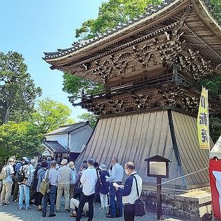 本堂前で滋賀県文化スポーツ部文化財保護課の長谷川先生の紹介があり、その後鐘楼の説明を受けました。