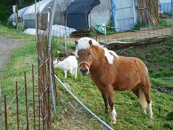 ポニーのチャコと子ヤギのミントが草を食べてますね。