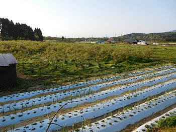 手前のイチゴ畑ではイチゴとニンニクが大きくなってきています。