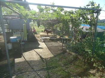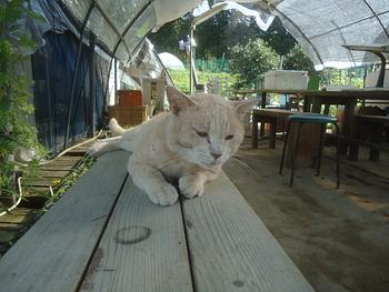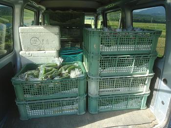 朝、農園に野菜を積み込みに行きました。チャーくんが寝ぼけ顔でお迎えです。