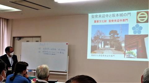 大河ドラマの「麒麟がくる」の主人公としての明智光秀から授業に入り、その人となりを西教寺に遺されている戦死者供養米寄進文書を参考にされた。 光秀ゆかりの寺の西教寺では明智一族の墓があることを紹介され、聖衆来迎寺では光秀が建てた坂本城の門を移築したという表門の調査結果も話されました。