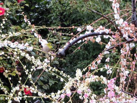 メジロが何羽かいましたので、シャッターを切ったら写っていました。