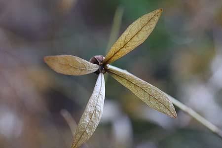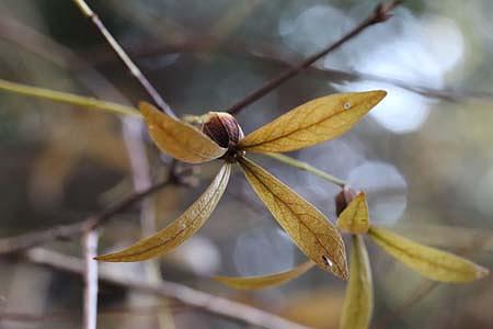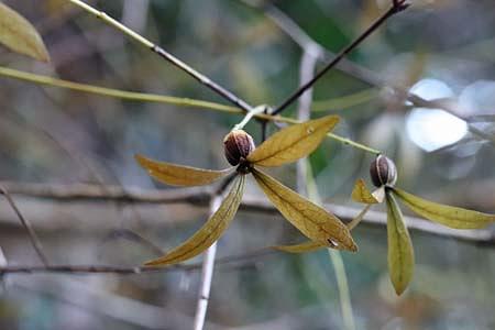 さてさて、タイトルの話題に、この時期の植物園は花の端境期で少なく。ほぼ、カメラを片手に散歩状態のことが多いです。この時期は、実が目立ちます。その実、種子を目当てに野鳥もやってくるので鳥狙いのカメラマンも多いです。その方たちは上を向き、私は下を向きながら撮影のネタを探します。そこで、見かけたのがタイトルの【旅立ち近し「ツクバネ」】です。