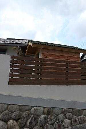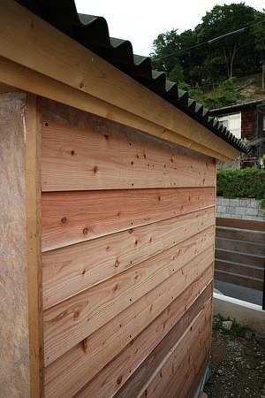 鎧(よろい)張りという横に板を貼る方法。杉板です。