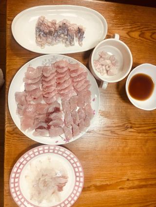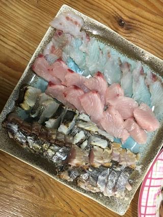 上からさわらの炙り焼き、スズキの白子と、さわらの刺身と、スズキの刺身と、フグ雑炊