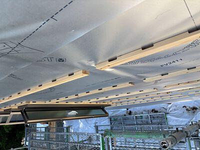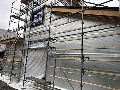 外壁下部の通気土台を通じて上昇気流で屋根上まで壁内の空気を吸いあげるイメージです。