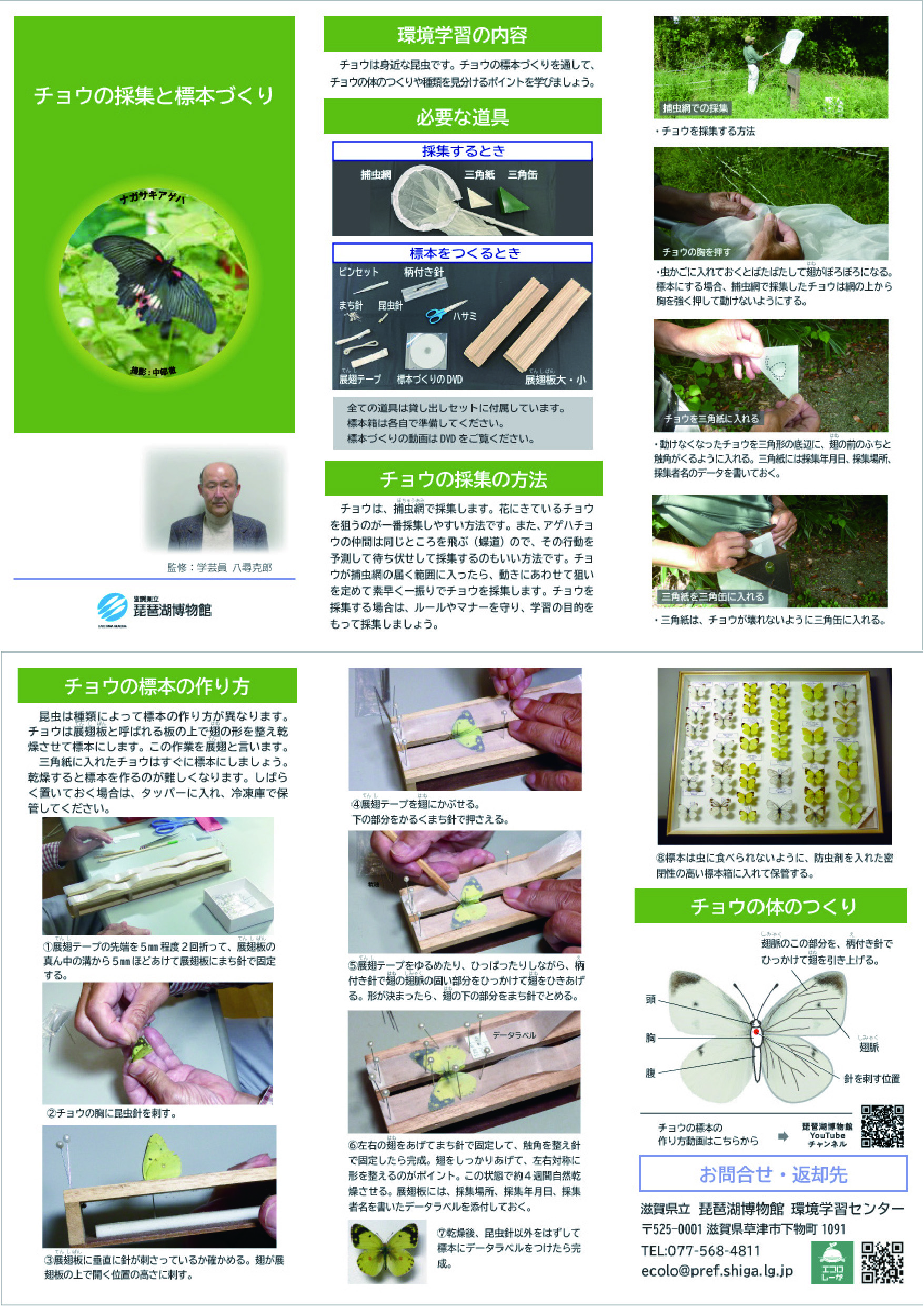 チョウを採集して標本を作ろう!・・・このリーフレットと「昆虫採集とチョウの標本作りセット」を借りればすぐできるよ!