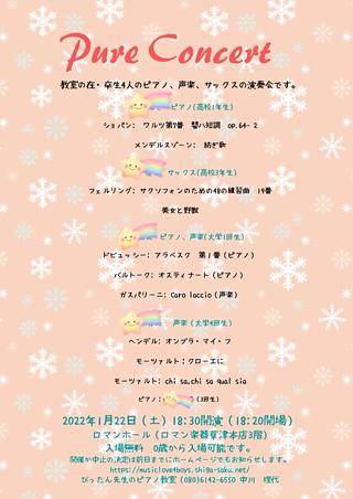 大変遅くなりましたが、2月に行なった、教室卒・在生4人のピアノ、声楽、サックスによるピュアコンサートの様子です。
