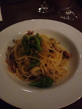メニューにないけど、ホタルイカと菜の花のスパゲッティをつくってもらって この写真も暗いっ!