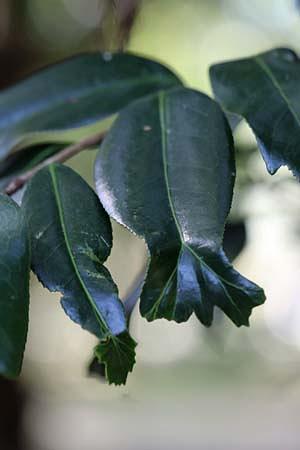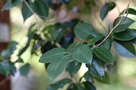 藪椿(ヤブツバキ)の葉が、帯化(たいか)という現象で葉の先端がユニークな形に変形することです。