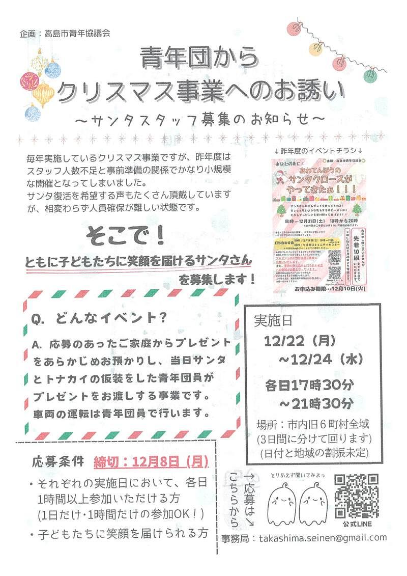 【12/8(月)締切】青年団からクリスマス事業へのお誘い-サンタスタッフ募集のお知らせ-