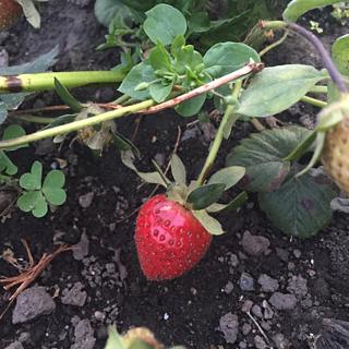 畑に娘ちゃんの苺が一つ出来てました