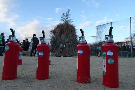 昨日(1/11)の朝の気温はものすごい寒さではありませんでしたが、暴風がものすごい。それに朝が一番気温が高く、時間と共に気温が下がる一日となりました。家が揺れそうに感じらるような強風でした。それでも、明るくなることには少し弱くなりました。もしかしたら、これならと思い、この地域の恒例行事の「とんど」の会場に行ってみました。多くの方々があつまり、来賓の方々もでした。主催者のマイクでは強風でとんどの点火は少し様子見ですと! 風もあることから消火器もたくさん良いされ、地元の消防車も万が一に備えて待機でした。風は中々弱まらず、そんな中で待機していた消防車が突然、サイレンを鳴らしながら走り出しました。もしかしたら、本物の火事だったのでしょうね。そんなこともあり、とんどへの点火は延期となりました。それでも、用意されたイベントは開催です。例年のごとく、豚汁、お汁粉、温かい飲み物は無料で提供され、ご近所の農家から提供された野菜たちが安く並び、飛ぶように売れていきます。この売り上げが、来年のとんどの運営資金となります。そうそう、去年は全くなかった、お米が売られており、すぐに完売でした。